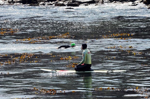 A swimmer passes a lifeguard on a surfboard in mid-morning light.