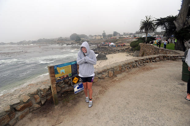 Young woman wears a hoodie to keep warm in a typical Monterey Bay early morning marine layer.