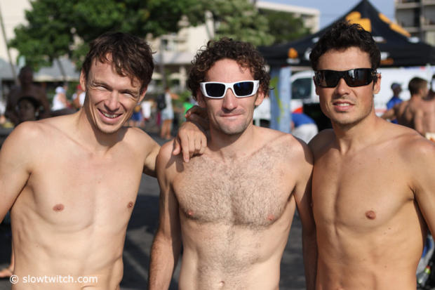 Simon Whitfield, Tim Don and Javier Gomez after their morning swim.