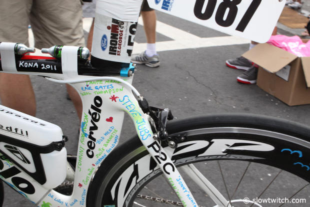 This athlete seemingly is paying tribute on his bike to various folks, including Steve