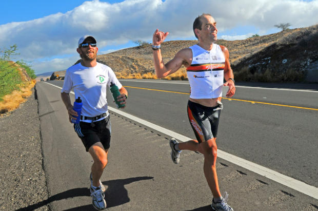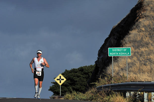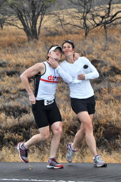 The run stage began in the dark at 6 AM, and the winds that buffeted cyclists the day before on the ascent and descent of the Kohala range pushed the runners with a tailwind on the first 17 downhill miles to Kawaihae – and threw in a few sidewind sections that had the front runners and back of the packers democratically leaning to stay on the road.