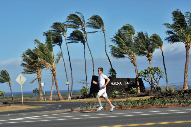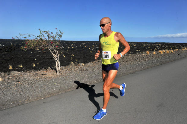 The tailwinds stayed fierce on the Queen K just before the halfway point. If you don't believe it, look at the palm tree leaves standing at attention as Michael Coughlin runs past on his way to a third-best 6:47:47 run and second place overall.