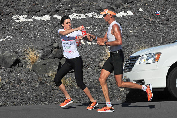 Miro Kregar’s daughter Lisa makes a smooth handoff of water to her father about Mile 30 of his race-best 6:24:10 run.