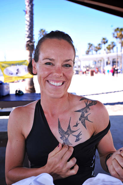 Heather Jackson shows off her beautiful bird tattoos at Oceanside.