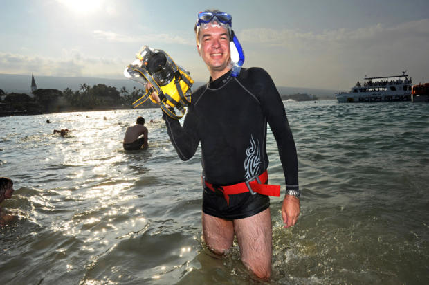 Triathlon photographer Michael Rauschendorfer with his underwater camera setup at Kailua Kona, Hawaii.