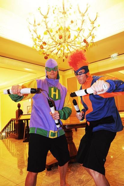 Tim DeBoom and photographer Eric Wynn in Ninja garb at the Halloween costume party at XTERRA Maui.