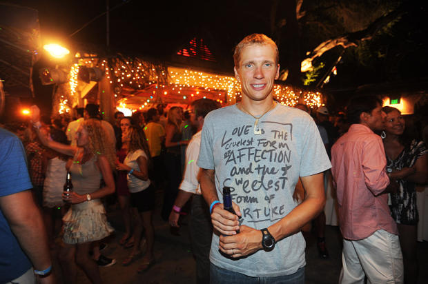 Estonian triathlete Marko Albert wearing a profound T-shirt at K-Swiss party at Huggo’s.