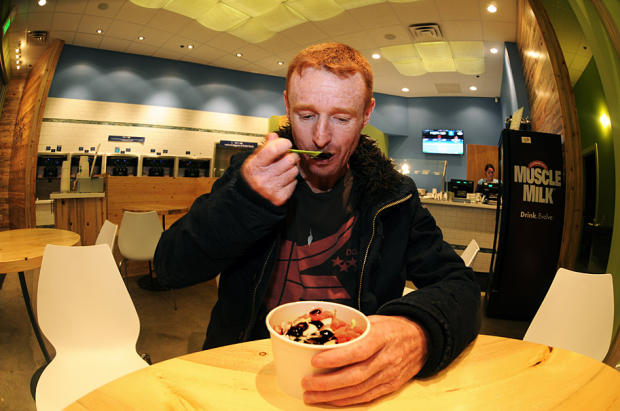 British pro triathlete James Hadley is here often for post-swimming yogurt and oatmeal.