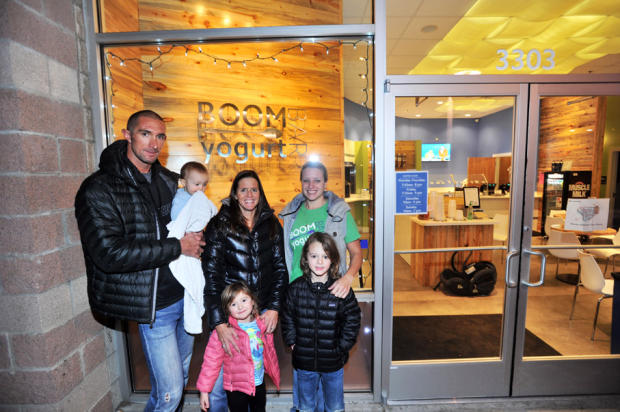 BOOM Yogurt Bar manager Kim Larson, an age group triathlete, with the Reed family outside the shop.