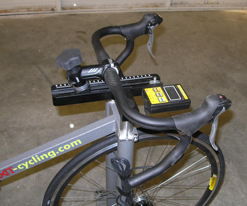 But we can at least simulate the incline, which is helpful in a few ways. First, we can see if, when out of the saddle, the rider is balanced over the crank, with no need to bend overmuch at the waist. Second, we don't need to "rock and roll" when riding seated, hands-on-tops. Third, if we have a problem with saddle tilt or saddle shape (I hate it when I'm sliding off the back of the saddle when seated climbing, we might find it out in the fit studio.