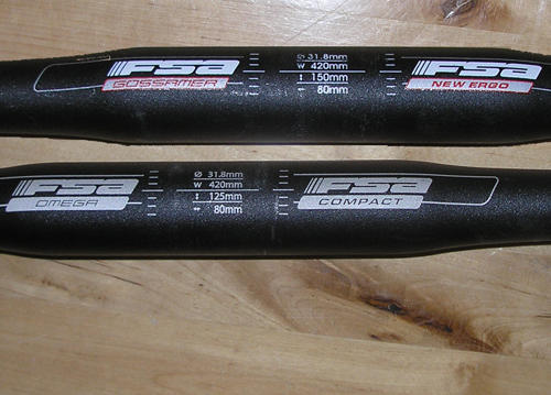 Back to the fit session described above. The default bars I tend to use most of the time are the workhorses made by FSA. These each have a (shortish) reach of 80mm, and they vary in drop: 125mm (shallow drop) versus 150mm (standard drop).