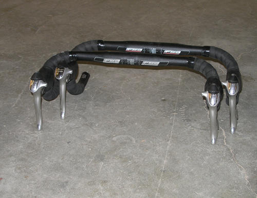 To assuage her discomfort I replaced the FSA bar with a Sampson ACO model, same drop, but 100mm reach, coupled with a shortening of the stem by 2cm. Presto, same drop, same saddle-to-hoods distance, same handlebar elevation, drops elevation, but, with one change: tops were brought in by 20mm—precisely what she wanted.
