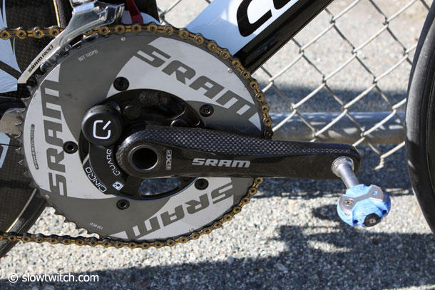 A massive 55cm chain ring and a Quarq power meter are at the heart of his bike.