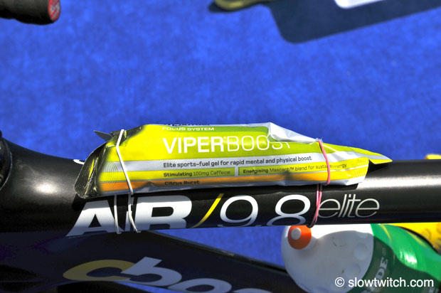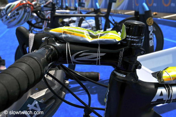 A Zipp Service Course SL stem and bar with Maxifuel Viper Boost gel attached, but no shorty TT bars.