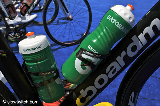 Two bottles to make sure young Brownlee isn't thirsty, held in place by Zipp carbon cages.