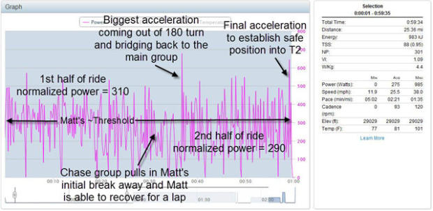 You can see 10-20 second efforts above threshold right out of T1 as he tried to pull ahead of Brownlee in the early part of the bike leg. He took 4 pulls of 20-30 seconds during the 1st 3 laps. His Normalized Power output of 310w for the first half versus 290w for the second half.