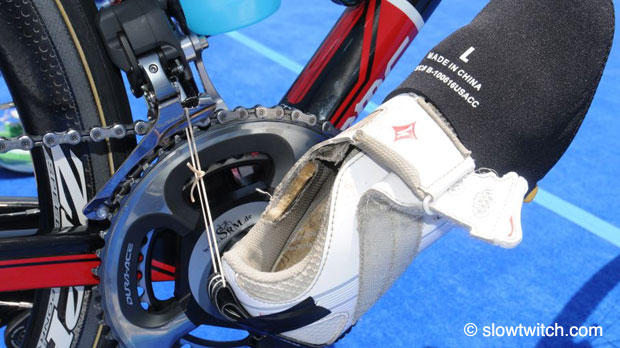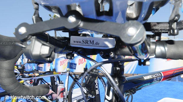 An SRM power meter and Specialized Trivent shoes with unbranded toe warmers.