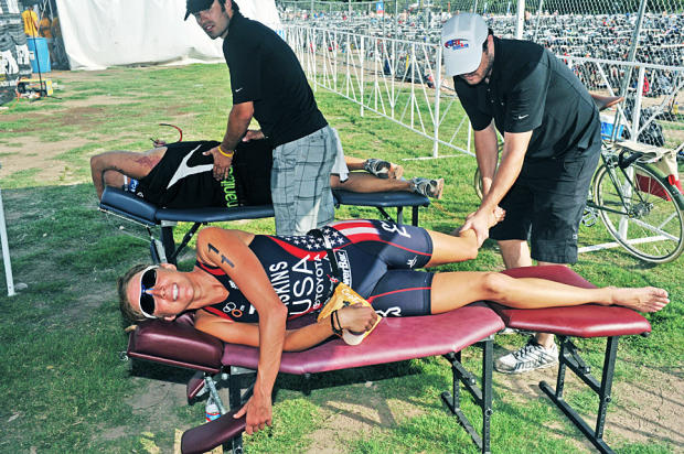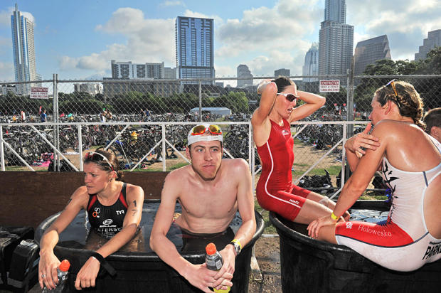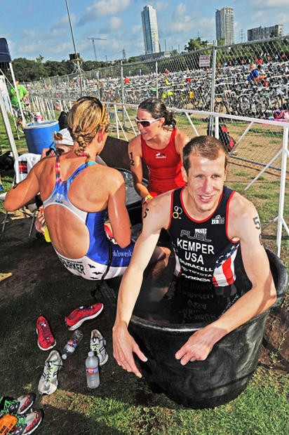 Hunter Kemper soaks his aching legs in a post-race ice water bath.
