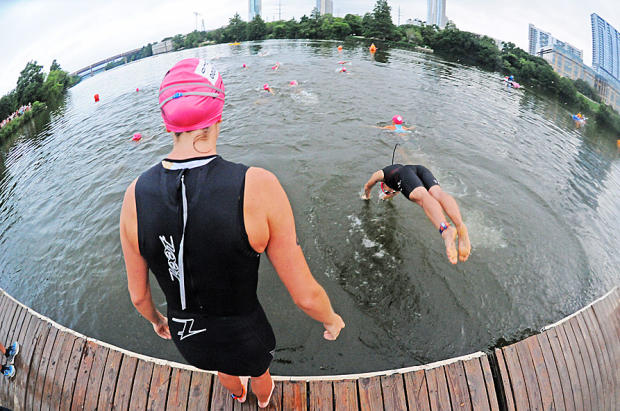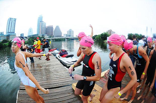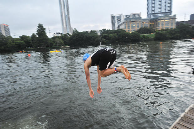 The women's elite field stretches gracefully before jumping in Lady Bird Lake.