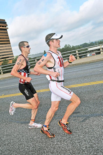 Andy Potts exits the swim 5 seconds behind Dustin McLarty.