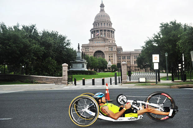 Paratriathlete powers past the capitol building in an aerodynamic reclining position.