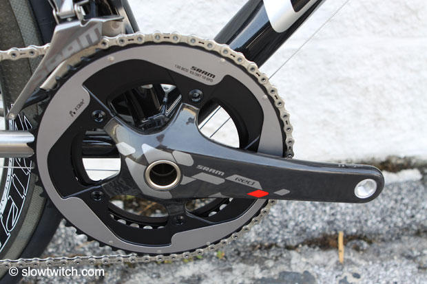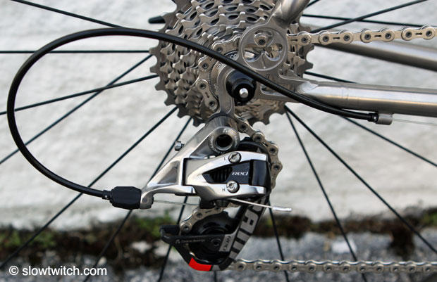 The transition from paint to naked titanium and the SRAM Red rear brake.