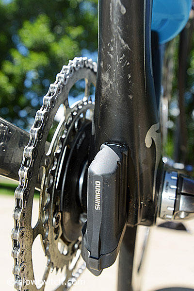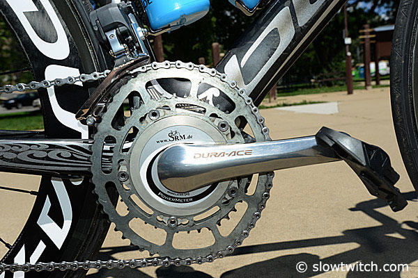 A Shimano Dura-Ace crank with an SRM power meter and custom chain rings for Gemell's pedal stroke.