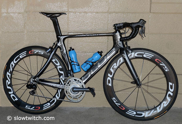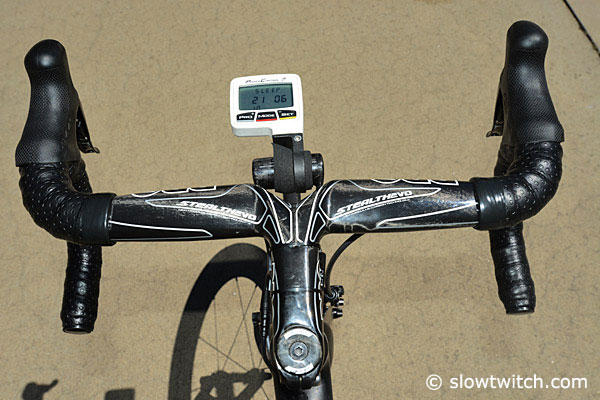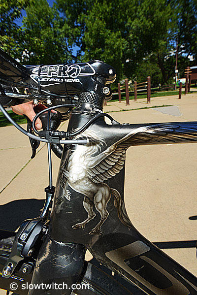 A Shimano Pro cockpit with a SRM display, but no aero bars.