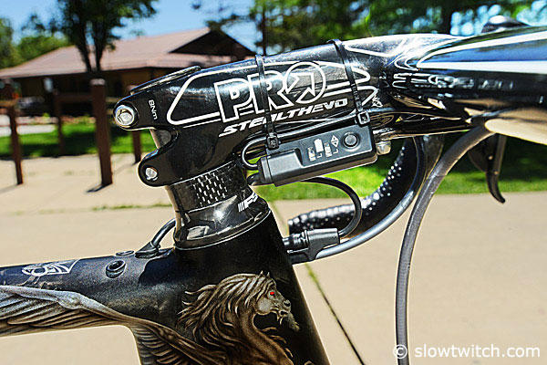 The Shimano Di2 junction box is tucked away under the Shimano Pro stem.