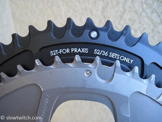 At first glance, these two chainrings look very similar. On top you have the Praxis ring, and below, a SRAM Red (2011).