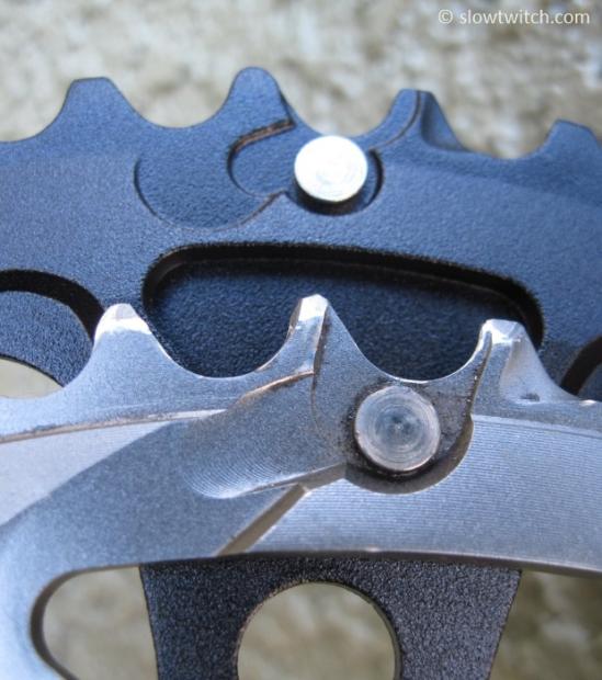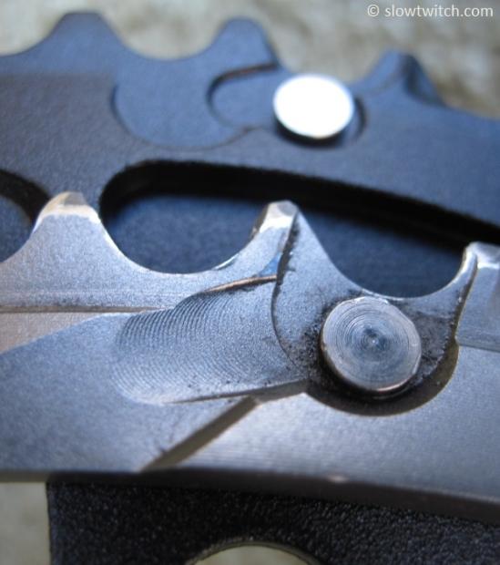 But a slight adjustment of focus reveals the machined nature of the SRAM ring. Those ridges are tell-tale marks from a mill bit making a quick pass to remove material from the back of the chainring.