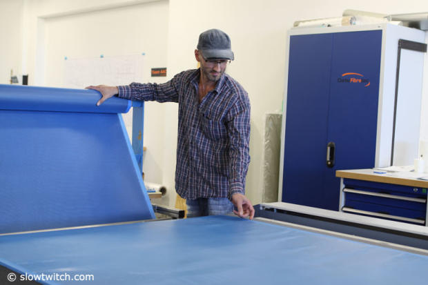Ali Saghir is a cutter and is setting up carbon fiber sheets to be trimmed here.