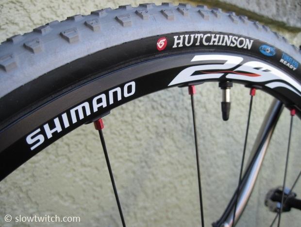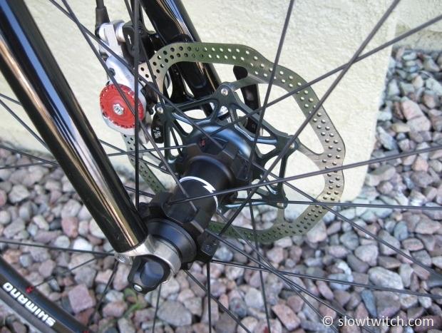 The wheels are Shimano’s WH-MT75 29er mountain bike wheels. Why 29” mountain wheels? My frame has mountain bike spacing – 100mm front, 135mm rear (which is quickly becoming the standard for disc brake cyclocross bikes). The rim diameter on cyclocross bikes is identical to that of a 29” mountain bike – 700c. So – the wheels plugged right in to my bike.
