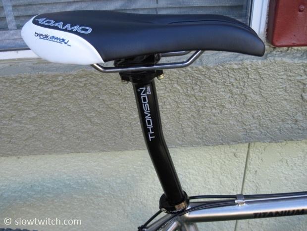I opted to steepen the seat tube angle slightly by using a Thomson setback seatpost, flipped forward. In my experience, this seatpost is a great choice for these “mid-steep” setups – it gets you forward just enough but retains the stability that the frame designer intended. And, they’re just fantastic seatposts in general. If I had to venture a guess, I’d say I’m sitting at an effective 75 or 76 degrees with this seatpost, and my ISM Breakaway saddle pushed most of the way forward.