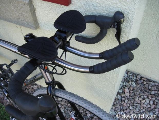 I originally tried the Zipp aluminum “ski tip” extensions. I think they’re great. They fit a lot of people, are reasonably priced, easy to cut, and hard to damage. The issue that arose was the fact that I’m not using a bar-end shifter plugged in to those great extensions. The extension-under-bar setup I’m using has a greater vertical distance from arm-pad-to-extension than any of the over-bar options. When you have a shifter plugged in, it lays just perfectly in your hands. But – without a shifter…
