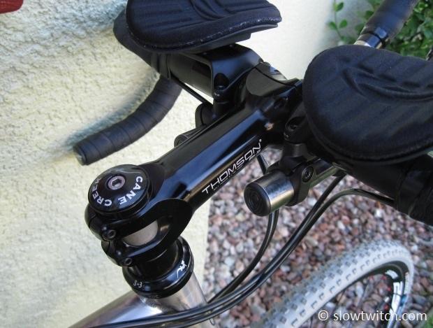 The stem is a Thomson X4 mountain bike stem. 120mm length and zero drop (90 degree). I went with zero drop to get a little lower than I was before (sans clip-ons, with a 6 degree stem, turned up)… but without getting too low. These stems are known for being rock solid, so it was an easy choice.
