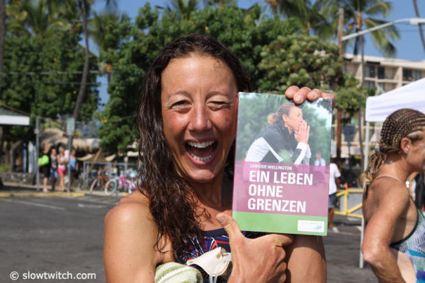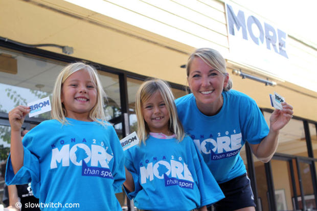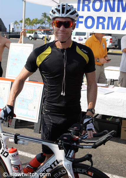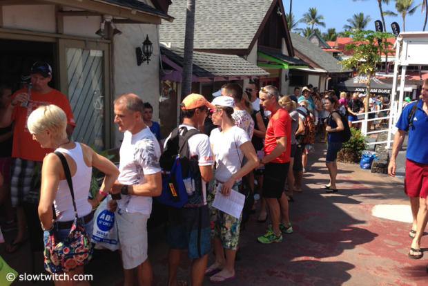 A huge line of Kona starters is ready to receive a free helmet from Rudy Project. Judging by this line and other folks we saw downtown with new helmets already in hand we ought to see tons of Wingspan helmets on Saturday.