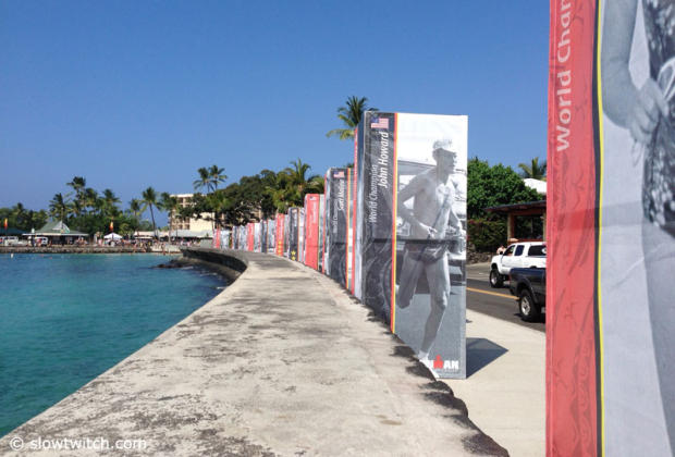 Along the pier banners remind folks of the Ironman Hawaii champions of the past.