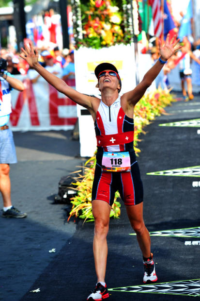 Six-time Ironman Hawaii champion Natascha Badmann finished 6th at age 45 and displayed that undiminished, radiant smile.
