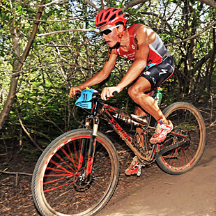 Javier Gomez: I had a really good swim but I knew guys like Conrad [Stoltz] are much better than me in the technical sections. So my tactic was try to push really hard uphill because I am fit and can go hard. Then on the downhill I don’t try to go crazy fast — just recover and not crash. I was surprised they caught me so late – at Mile 14. Then Conrad came by and I tried to stay with him. Finally in the last technical section before transition, he made a little gap – maybe 20, 30 seconds. I was really tired for the run but I just started quite hard the first 2 miles. Then as I was ahead, I tried to control the gap.
