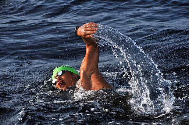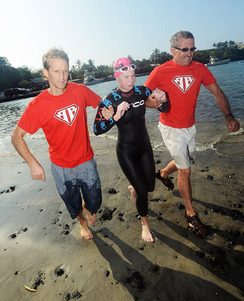 Support crews help competitors exit the 10k swim.