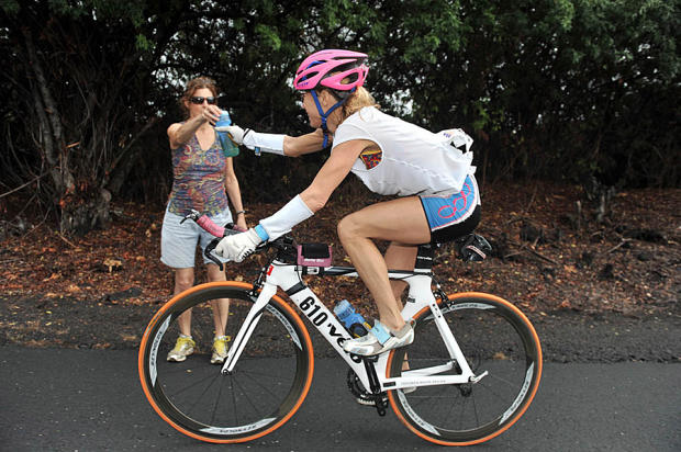Kathy Winkler gets a drink from her support crew.