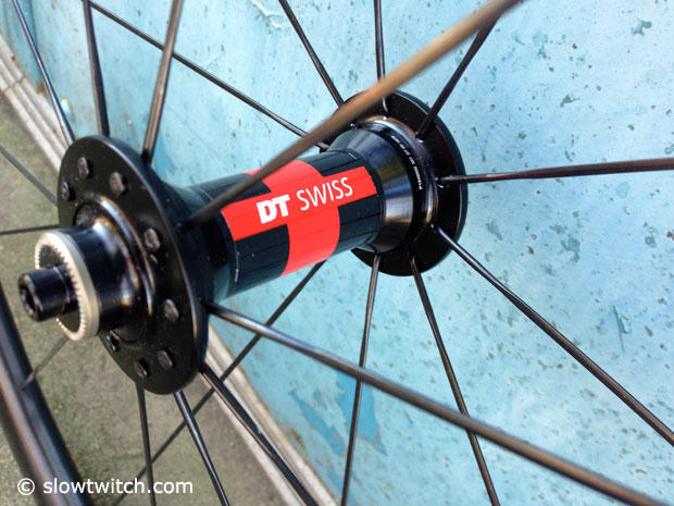 The DT Swiss 240 rear hub is laced up with 24 spokes.