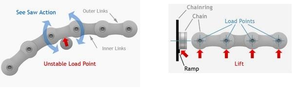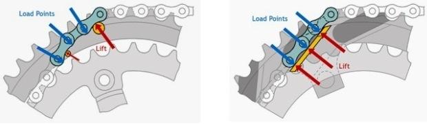 They say that the BRIDGE technology spreads the load out over a much greater area, offering a quicker shift, and less chance that the chain will slip off and result in shift hesitation. Again, in the image below, a standard ring is on the left, and WickWerks is on the right: