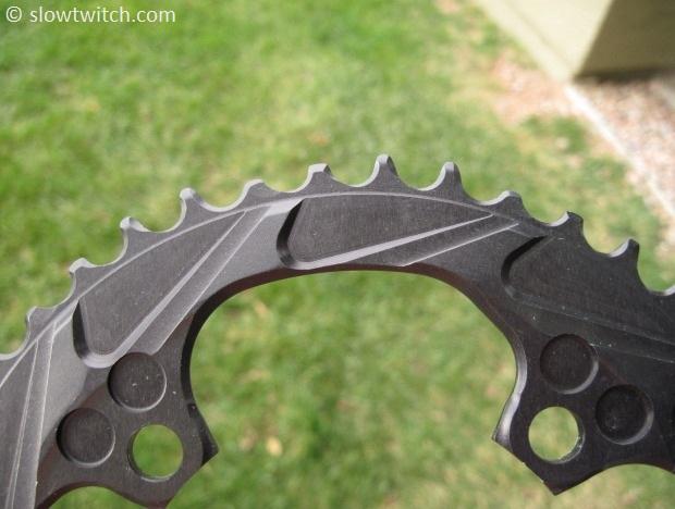 The other obvious big difference is the fact that the ramps occur at much more frequent intervals than a normal ring. My WickWerks 44 tooth mountain bike ring, for example, has 11 of these large ramps. The idea is that you can shift at any point in the pedal stroke, and get a good shift every time. In contrast, a standard ring might only have two or three of these major shift points.