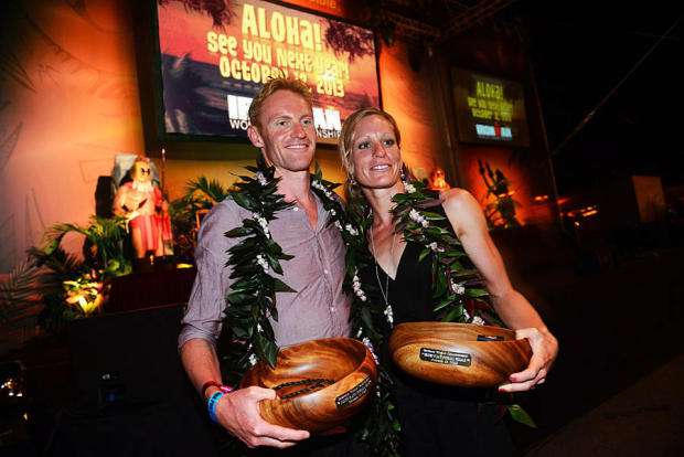 David Dellow of Australia (9th) and Caroline Steffen of Switzerland (2nd) after picking up their Ironman World Championship awards.