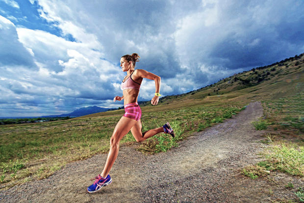 Julia Grant of New Zealand takes a long stride downhill on a Boulder trail.