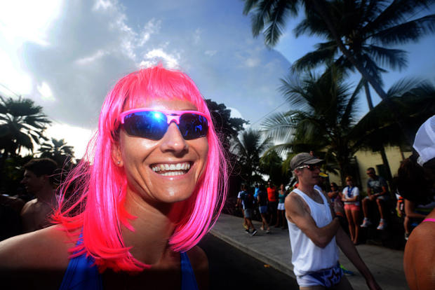 Ultraman competitor Kevin Becker and his merry support crew managed a joyful leap after 3 days and 320 miles spent in a triathletic circumnavigation of the Big Island.