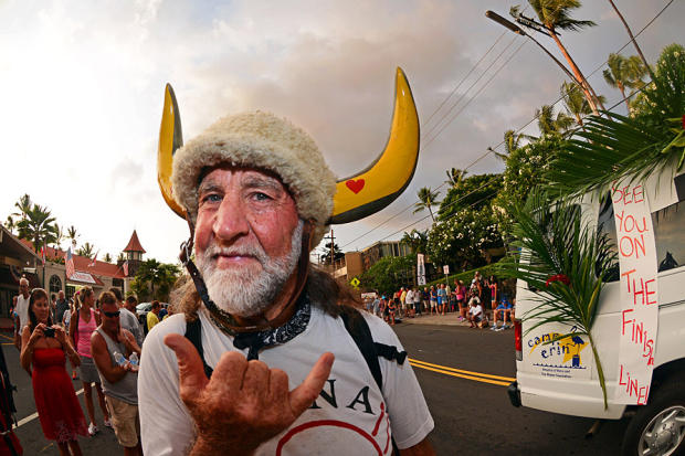 After a few years without his famous horns, Cowman replaced his lost talisman and was a welcome sight at the Kona parade of nations.