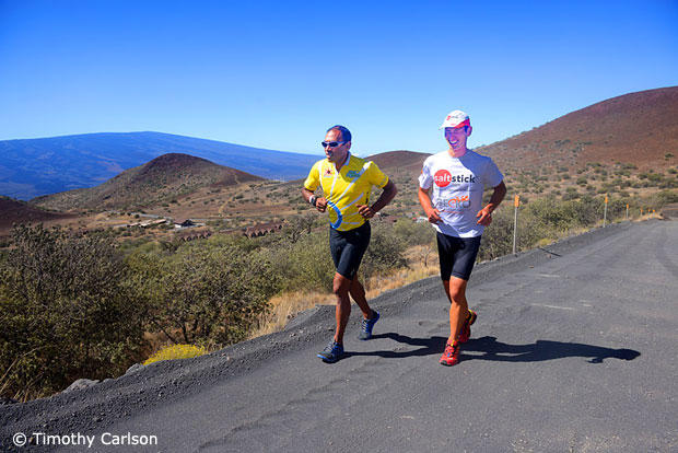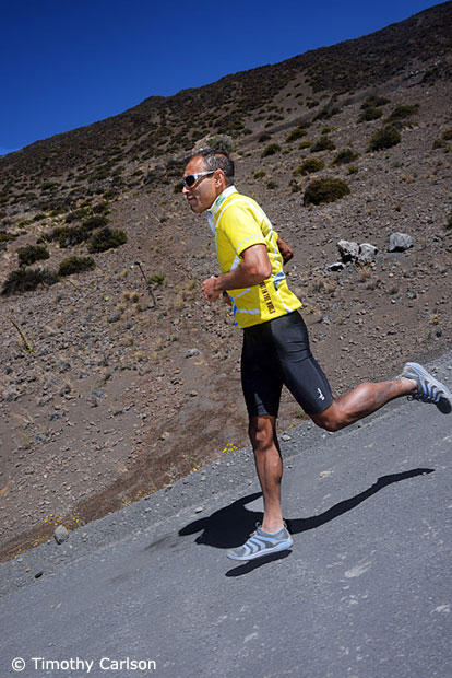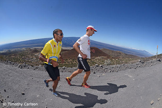 Amazingly, losing the extra 20 lbs of bike, helmet and shoes made running up the 15% gravel grade feel easier than the riding we had just completed on the tarmac. Perhaps this is because you can choose your gearing while running. On the bike, being locked into the 34×32, the only way to modulate effort was with less or more RPM. Running up the gravel, we were able to change stride length and cadence, going from a fast shuffle to a slow shuffle to a glorified hike masquerading as a run. Well, if the definition of running is the inverse of race walking, then we can say that yes, we did run. But calling it running was a loose description. In race walking one foot must always maintain contact with the ground so by definition in running you must take flight by have no feet on the ground, even if it is for an instant. On Mauna Kea, at times it felt like both feet were simultaneously on the ground, but who cares?